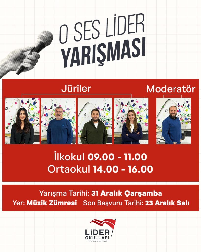 Lider Okulları Öğrenci Meclisi’nin organizasyonu ve müzik öğretmenlerimizin katkılarıyla düzenlenen O Ses Lider Yarışması, yetenekli sesleri sahneyle buluşturuyor. Müzik dolu bu özel etkinlikte öğrencilerimiz performanslarını sergileyerek keyifli ve heyecanlı bir deneyim yaşayacak.