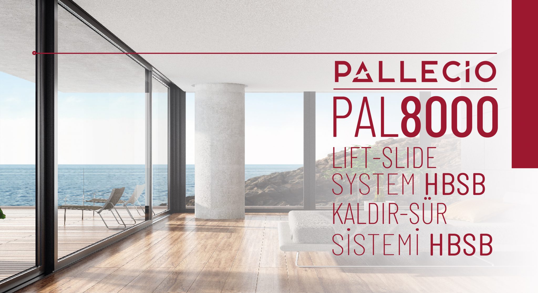 PAL8000 Sistemi, kaldır-sür pencere ve kapı tipleri için tam çözüm olanağı sağlar. Otomatik kaldır-sür mekanizma olanağı mevcuttur. Yüksek hava, su ve rüzgar yalıtımı sağlar.